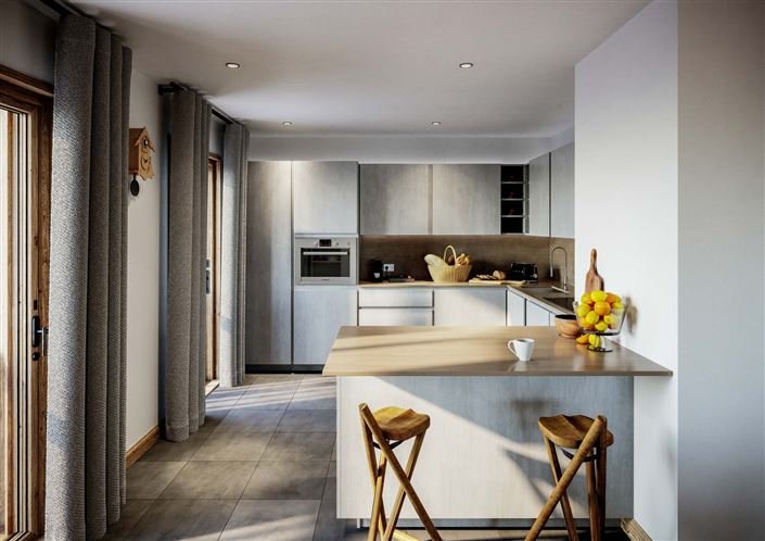 Apartments and chalets delivered with fitted kitchen, underfloor heating, balcony or terrace, underground parking, and private ski locker. Private garden and cellar available for certain Apartments