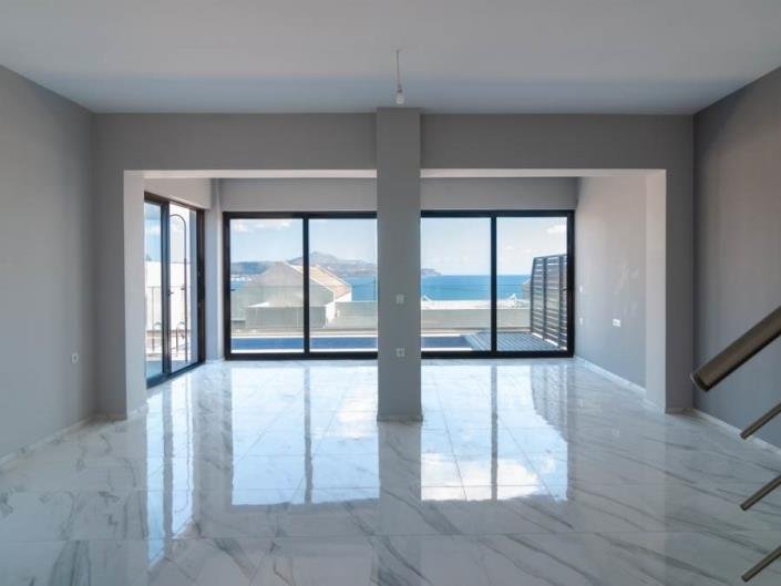 Right behind the living room, the dining room of the house is an open plan space with both the living room and the kitchen further behind it. At the southeast side of the main open-plan space lies one of the two bathrooms, a storage room, and an interior staircase that takes us up to the first floor. The upper floor is laid out with the two bedrooms of the house taking over the north part that is completely open to the big blue of the horizon. The large balcony at the front offers abundant space for outdoor furniture, a perfect spot for warm summer evenings and spectacular sunsets.