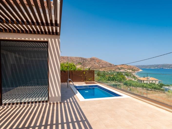 Part of a beautiful new project that is built on an amphitheatrical plot at the outskirts of the village of Kalyves, this single floor, 103,41 sq m r/ semi-detached residence offers unrestricted views of the seaside that lies almost at arm’s reach from the complex.