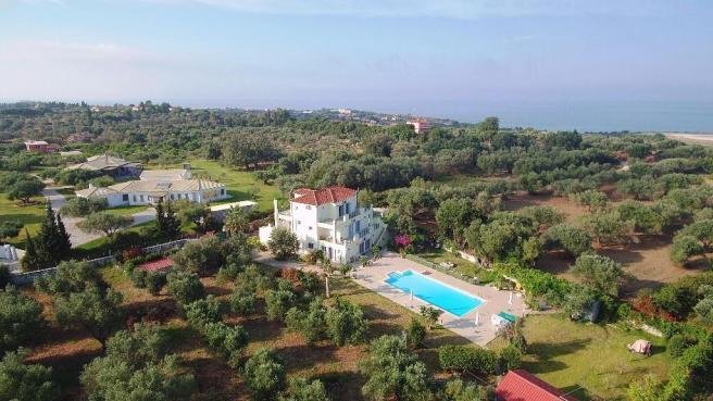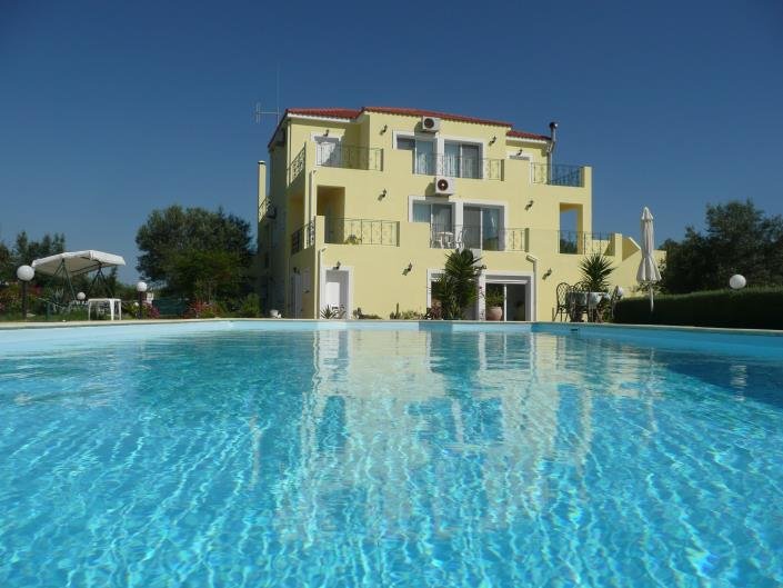 The three apartments are independent with their own entrance and they have access to the garden and the pool. The ground floor apartment 140 sq.m., has a living-dining room, a kitchen, 2 bathrooms, and 3 bedrooms. The first-floor apartment has a living-dining room, a kitchen, 2 bathrooms, and 2 bedrooms with terraces around.