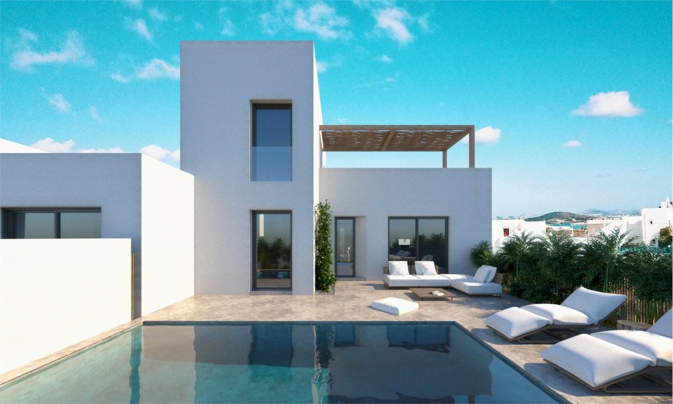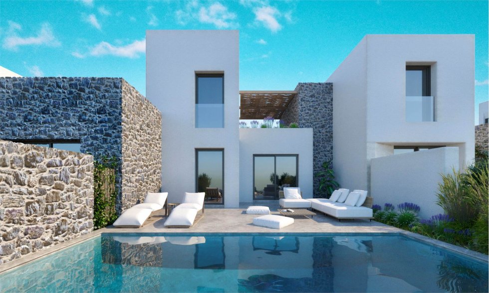Each house consists of a kitchen-living room, two or three bedrooms, two bathrooms, a nice external patio with a swimming pool and garden.