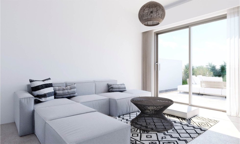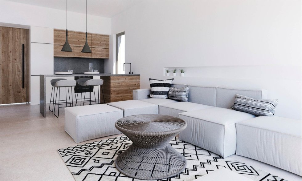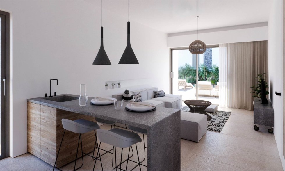 Areas from 63,29 sq.m: 2/3 bedrooms, 2 bathrooms, living room, kitchen, large private garden with pool.