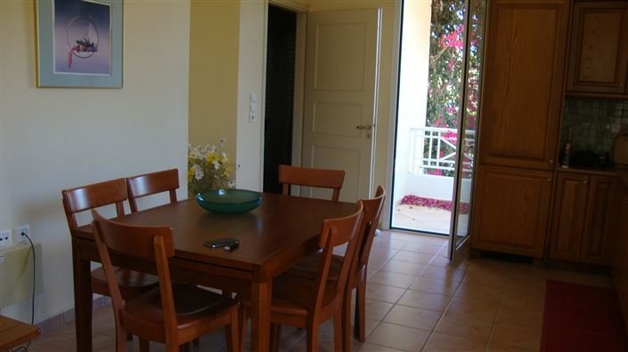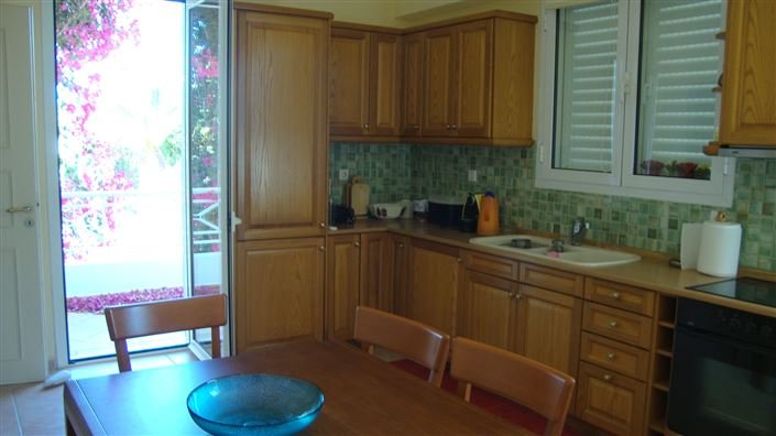 The property is laid out over two floors (122 sqm +61 sqm), with the centerpiece being the main living space which is open plan in design – a spacious living room with a seating and dining area. Interiors are light, bright, and airy, with adequate ceilings and wood features throughout. There are large balcony doors that lead out to the covered external area, and from the first-floor terrace, you can get wonderful views of the Aegean Sea and the Cretan countryside. There is a large fully equipped wooden kitchen that has space for informal breakfast dining.