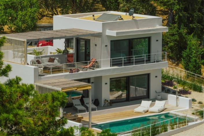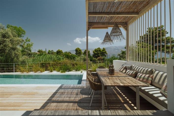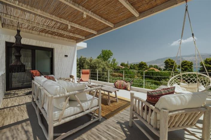 An attractive wood door opens onto a welcoming open-plan living area where large sliding doors open out to an outdoor dining table and a deck that runs along the length of the quartz-finished salt-water pool. To the left of the living room is a bedroom suite with its own ensuite shower room, where here too glass doors open onto the sunbathing terrace and pool. Up the stairs from the entrance is the master suite with its own shower room and its own terrace fitted with outdoor couches, lounge chairs, and a swing...the perfect place for one to get away from it all while gazing at the sea.