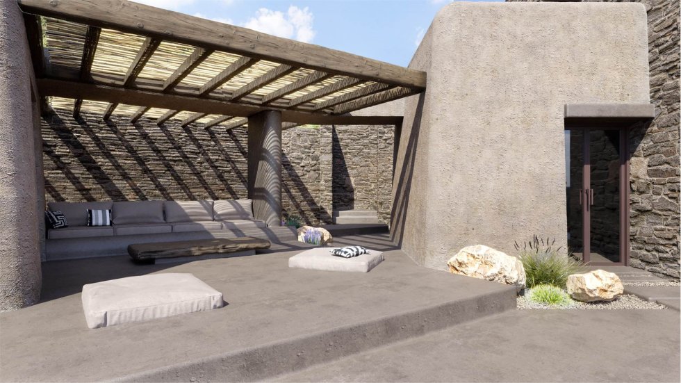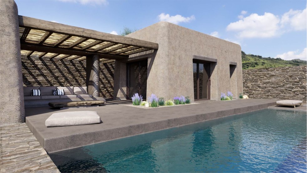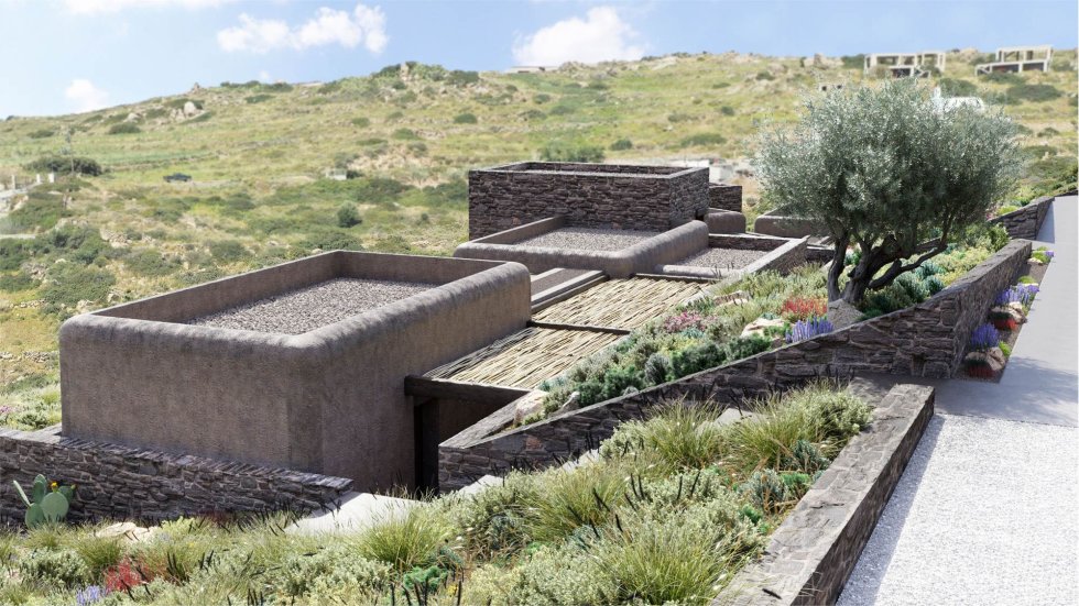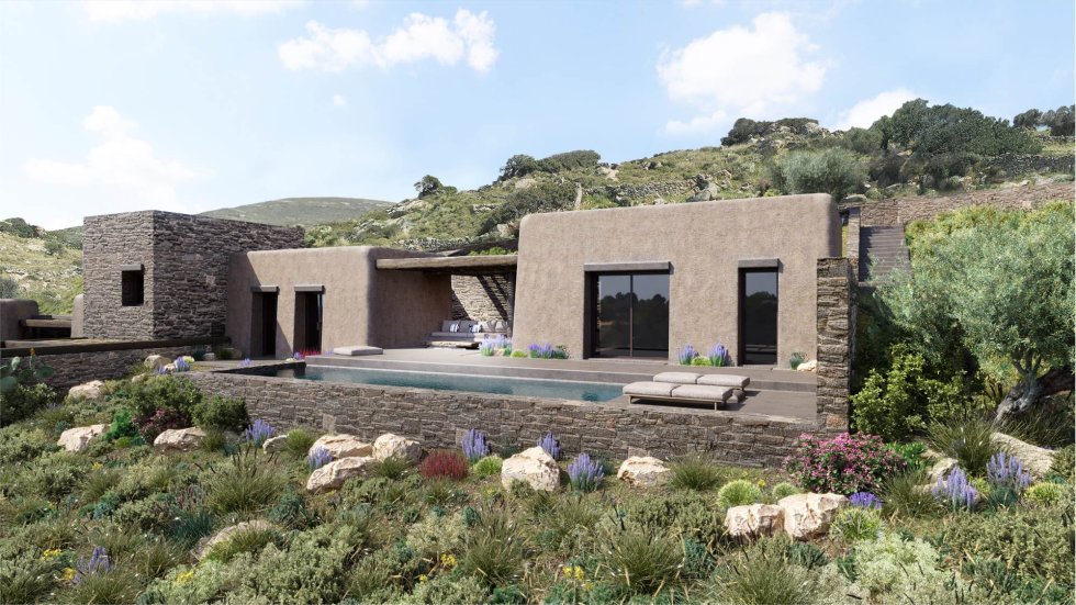 The houses harmoniously combine elements of modern and traditional Cycladic architecture, leading to a unique architectural result and design from the GFRA architects.