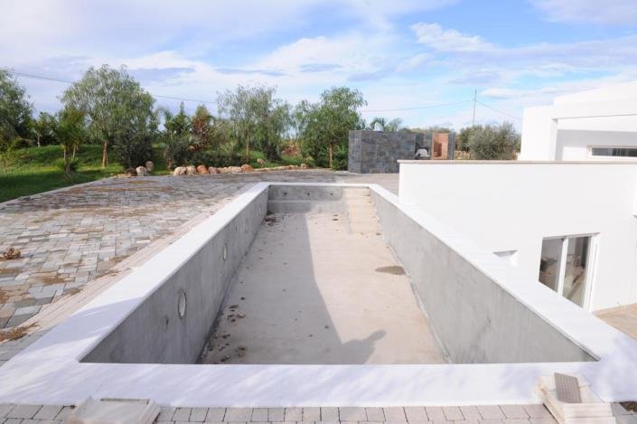 A villa with a swimming pool under construction on a plot of approx. 6500 sqm. Internally the villa extends for a total of 200 square meters of which c. To. 60 sqm on the ground floor comprising an entrance into the living room with large windows overlooking the garden, open space kitchen, and bathroom.