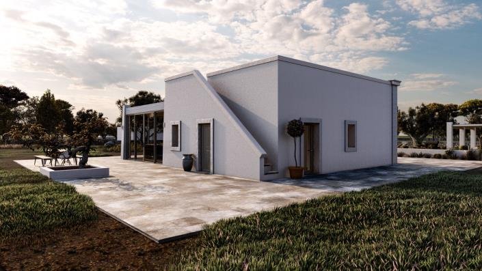 The property is located on land surrounded by beautiful olive trees and consists of an entrance/living room, three comfortable bedrooms, four bathrooms, a technical room, and a veranda.