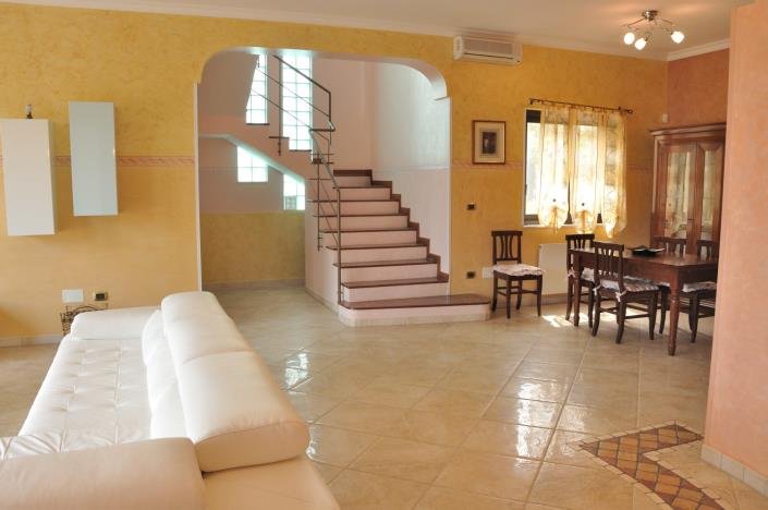 The villa is on two levels, on the ground floor with access from the square through a hallway you enter the large living room with a fireplace with a large window on the square in front, from the same open space living room you enter the kitchen with masonry island, as well as to the laundry room and bathroom on the ground floor. From the aforementioned living room, through the comfortable wood-covered masonry staircase, you enter the sleeping area on the first floor and composed of a hallway, and three bedrooms, one with an equipped walk-in closet, two further large bedrooms, and one with an adjoining closet.
