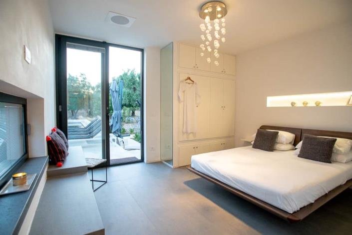 The glass sliding doors in the living space and main bedroom create a light and airy feel. Furnishings and fittings throughout are of a very high standard; tactile grey porcelain flooring, subtle lighting, electric windows as well as luxury fabrics - great if you like a rustic setting with a large dollop of style!
