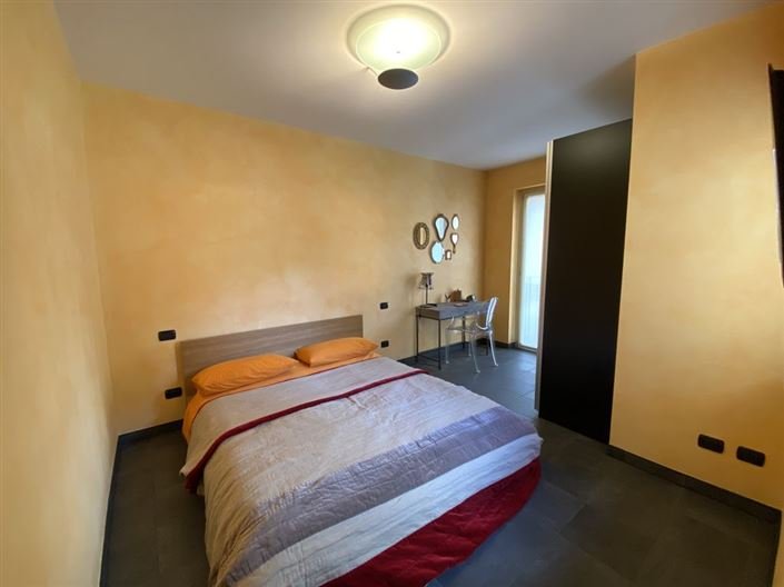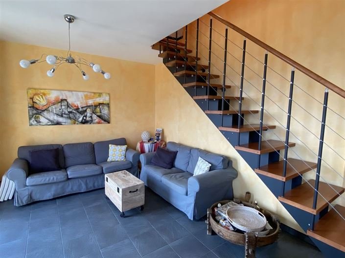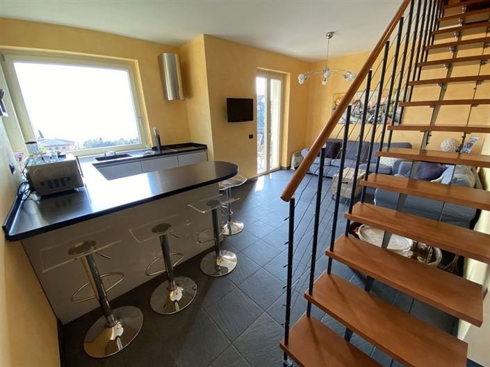 The apartment provides about 130m2m2 of accommodation over two floors, namely the first and loft area. The entrance leads into a bright open plan living room with doors leading to a terrace with room to relax or dine and lovely views over the lake. The kitchenette, which benefits from double aspect windows, leads from the living room and there is also a double bedroom and wide bathroom with a shower. Stairs from the living area lead to the attic floor where there are a further two rooms, used as bedrooms and a bathroom with tub.