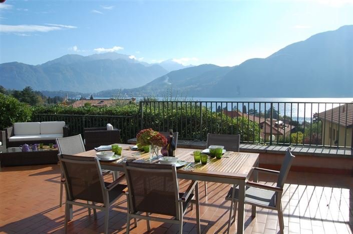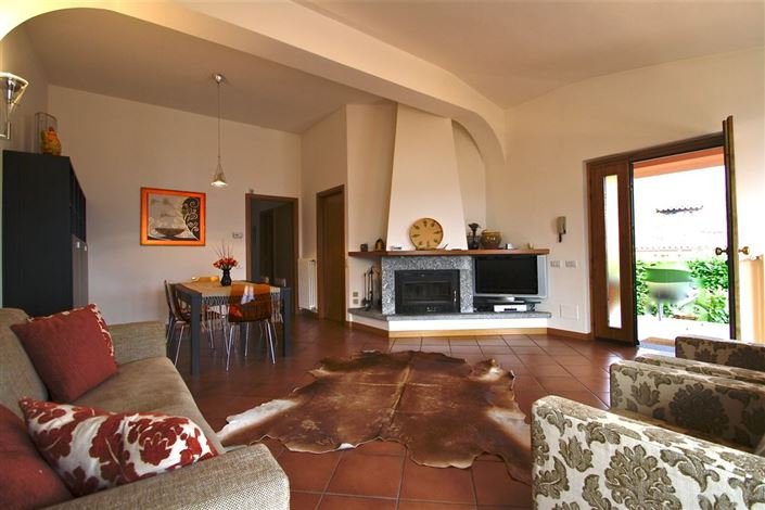 The villa provides spacious accommodation with a bright and wide living room with a fireplace and dining area to one side and two sets of French doors that lead out to a spacious terrace with ample room for dining and relaxing.
