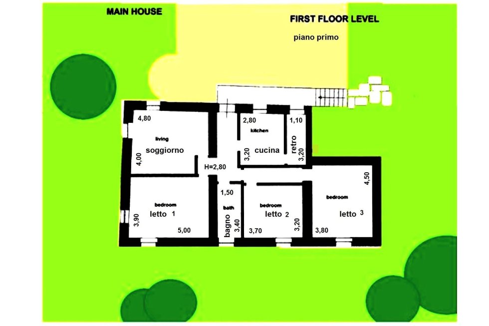 On the first floor, accessible from the external staircase, the house consists of a kitchen with fireplace, back kitchen, large living room, three bedrooms and bathroom.