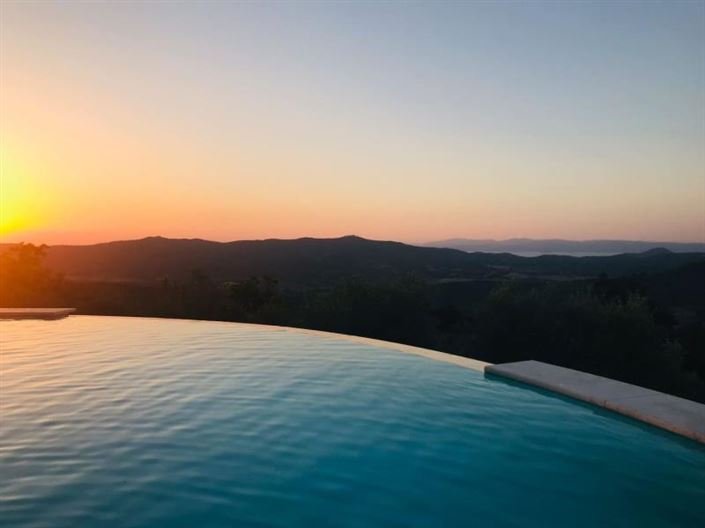 The property includes an infinity pool with a jacuzzi/hydro massage pool attached, renovated barn, adjacent to the swimming pool, 1.5 hectares of land with olive trees and woodland, a large car park, a garage, and various storage spaces on the ground floor.