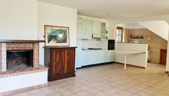 The property can be reached from the provincial road and, after a short stretch of one hundred meters of a private road, you enter the driveway that leads to the house, surrounded by a large garden.The property consists of a ground floor with a garage and technical room;a mezzanine floor comprising an entrance to the dining room with an adjoining kitchenette, a living room with a panoramic balcony, and a hallway that opens to a bedroom and a bathroom.