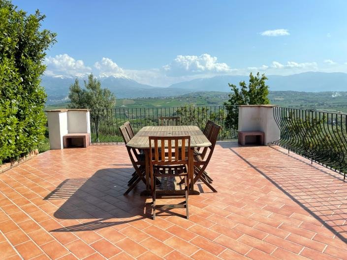 The house, perched on a hill with a view of the Majella and Morrone mountains, is surrounded by approx. 2.000 sqm. of well-kept garden with a well, 42 olive trees, and fruit trees.