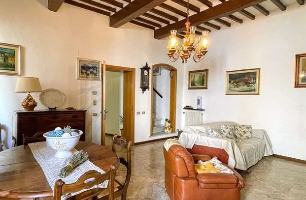 This spacious Tuscan apartment is located on the first and second floors of a historical building in the pretty village of Chianni. The entrance is from the cobbled lane on the ground floor into an atrium and corridor which is shared with another house, then going up the stairs to reach the private entrance. The house consists of welcoming and equipped kitchen, a large living room with a fireplace, and the four large bedrooms on the second floor, two of which extend onto the panoramic balcony overlooking the hills and the town. Two modern bathrooms. Beautifully light and airy, with high ceilings, plenty of light from the large windows and the balcony, and warmth from the beamed ceilings and Tuscan touches. Perfect as a 'lock up and leave', for home or rental, and as a great base to explore the whole of Tuscany.