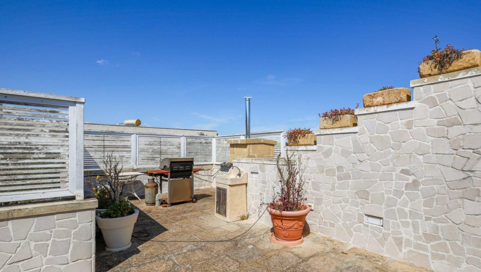 The Villa is on two levels, and covers an area of 136 square meters, with a garden on the ground floor of about 100 square meters. The sun paved terrace is equipped for lunches and dinners, with a barbecue, pizza, and bread oven.