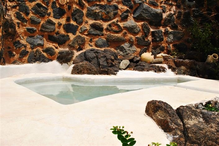 Outside large terrace with an outdoor kitchen, and a patio furnished with garden furniture, In the part below the dammuso there are two separate and independent annexes with a double bedroom and bathroom with a shower, living room, kitchenette, and balcony. Outside a swimming pool with a Jacuzzi with a waterfall and a large sun terrace for guests. Sea view, sunset view. Outdoor laundry, parking, and a swimming pool are accessible to children.