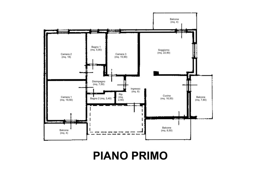 Kitchen with fireplace sqm. 16.50 with balcony sqm. 8.50 and additional balcony sqm. 7.80;