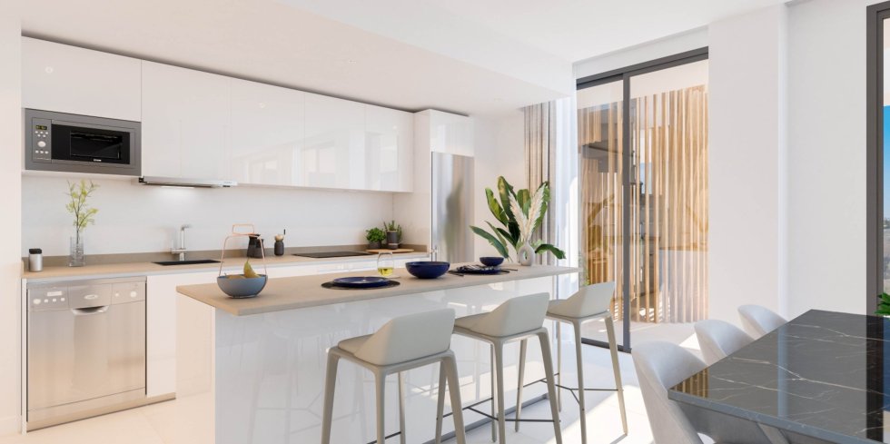 • KITCHEN Fully equipped kitchens with high and low furniture, siltstone or similar type countertop and appliances with energy rating A or higher: ceramic hob, oven, microwave, extractor hood, refrigerator, dishwasher, washer/dryer. Possibility of upgrading with different kitchen options.