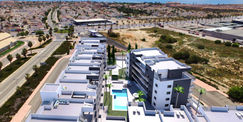 The top-floor units include a roof-top solarium. The 2-bed units have a terrace between 22m2 and 28m2 with a solarium ranging between 93m2 to 97m2 and a total area including the terrace of between 101m2 too 110m2. The 3-bedroom units have a 23m2 terrace with a 127m2 solarium and a total, including the terrace, of 141m2.