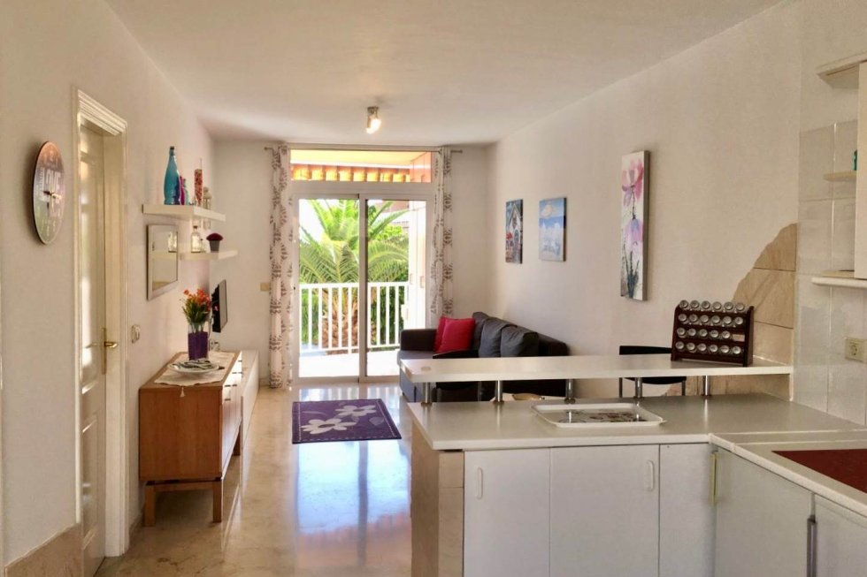 In Adeje, within the coastal village Playa Paraiso, for sale an apartment located on the first floor with lift, consisting of a living room with kitchen and balcony, a bedroom, a bathroom with tub and a parking space within the complex.