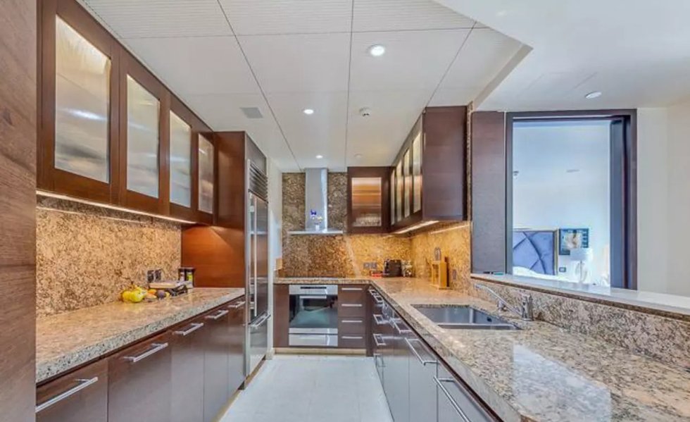 A captivating horseshoe kitchen with inbuilt appliances, marble surfaces, and an induction cooktop, perfectly suitable for cooking up your specialty